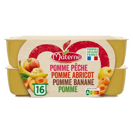 Pomme : pomme origine France 96,1 %, sucre, jus de citron concentré (si nécessaire pour réguler l'acidité), antioxydant : acide ascorbique. Pomme Pêche : pomme origine France 70,6 %, pêche origine France 25,0 %, sucre, arôme naturel, jus de citron concentré (si nécessaire pour réguler l'acidité), antioxydant : acide ascorbique Pomme Abricot : pomme origine France 65,5 %, abricot 30,0 %, sucre, arôme naturel, jus de citron concentré (si nécessaire pour réguler l'acidité), antioxydant : acide ascorbique. Pomme Banane : pomme origine France 78,2 %, banane 20,1 %, sucre, jus de citron concentré (si nécessaire de réguler l’acidité), antioxydant : acide ascorbique.