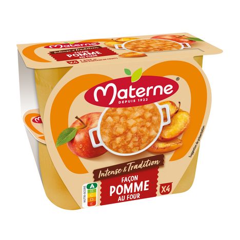"Découvrez Materne® Intense et Tradition ! Une nouvelle gamme s'inspirant des fruits cuits au four : un bon gout de fruit intense et des morceaux de fruits fondants et caramélisés, qui vous replongeront dans vos souvenirs d'enfance. Un dessert gourmand tout en légèreté, Nutri-score A. Quelle recette vous fera fondre de plaisir ? Façon Pomme au four ; Façon Abricot au four ou encore Façon Ananas au four ? "