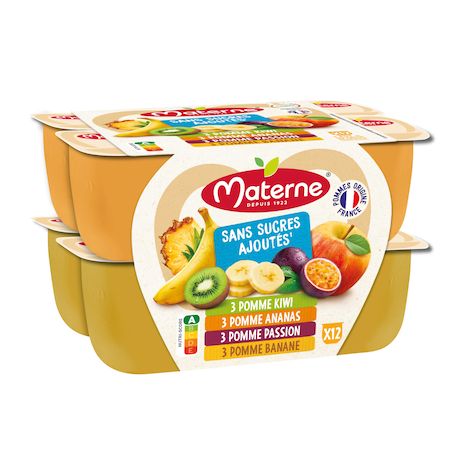Spécialité de pomme ananas avec arôme naturel sans sucres ajoutés (contient des sucres naturellement présents). Spécialité de pomme kiwi avec arôme naturel sans sucres ajoutés (contient des sucres naturellement présents). Spécialité de pomme passion avec arôme naturel sans sucres ajoutés (contient des sucres naturellement présents). Purée de pomme banane sans sucres ajoutés (contient des sucres naturellement présents).