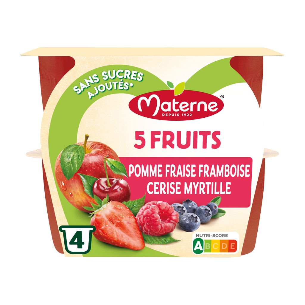 1, 2, 3, 4.. 5 FRUITS ! Pour vous permettre de varier les plaisirs, Materne® s'est mis en 4 pour trouver des associations inédites de 5 fruits pour un goût intense. A déguster ni une ni deux pour un plaisir unique ! Des recettes gourmandes, sans sucres ajoutés* et source de vitamine C, qui plairont aux petits et aux grands gourmands ! * Contient des sucres naturellement présents.