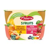 1, 2, 3, 4.. 5 FRUITS ! Pour vous permettre de varier les plaisirs, Materne® s'est mis en 4 pour trouver des associations inédites de 5 fruits pour un goût intense. A déguster ni une ni deux pour un plaisir unique ! Des recettes gourmandes, sans sucres ajoutés* et source de vitamine C, qui plairont aux petits et aux grands gourmands ! * Contient des sucres naturellement présents.