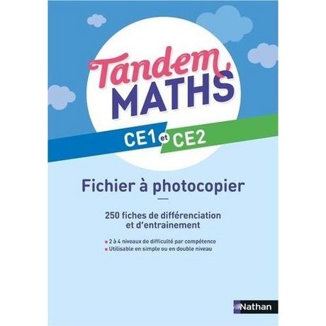 Une méthode qui s'adapte à toutes vos configurations de alte, année après année ! Un fichier de différenciation à photocopier CE1-CE2, utilisable en simple ou double niveau : 260 fiches de différenciation et d'entrainement photocopiables 2 à 4 niveaux de difficulté par compétence, qui suivent la progression des fichiers de l'élève. Tandem CE c'est : Une organisation simple et ritualisée quel que soit le domaine d'apprentissage : 1. Une séance d'apprentissage animée par le diaporama. 2. Une synthèse collective et un mini quiz pour vérifier la compréhension 3. Un entrainement en autonomie dans le fichier ou le cahier de géométrie. Une méthode adaptée aux doubles niveaux CE1-CE2