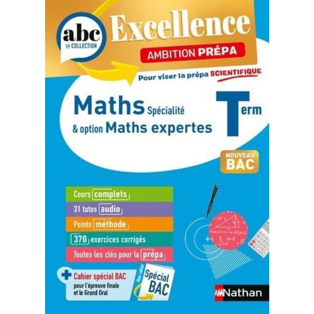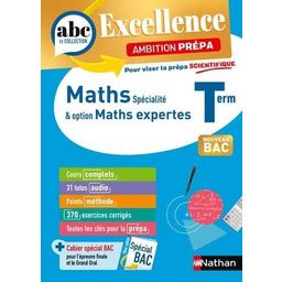 Des cours, de l'approfondissement, de la méthode, des exercices minutés et des corrigés détaillés pour réviser les Mathématiques (enseigement de spécialité) et les Maths expertes (enseignement optionnel) en Terminale. Une édition spécialement conçue pour les élèves qui visent la prépa scientifique ! Conforme à la réforme du Lycée ABC du BAC Excellence Mathématiques Tle / Ambition Prépa Pour briller le jour du Bac et anticiper la prépa scientifique ! - Approfondissez toutes les notions du programme. - Renforcez vos connaissances à l'aide des rubriques : Remarque, Astuces, Pour aller plus loin... . - Entraînez-vous à l'aide de très nombreux exercices originaux et variés , de sujets type bac et de leurs corrigés contenant toutes les étapes de calcul et des indications de méthode. - Préparez-vous intensivement aux épreuves du bac. - Visez la prépa scientifique (MPSI, PCSI, PTSI, MPII...) grâce aux pages Ambition prépa : - La rubrique Prépa attitude : pour prendre du recul sur les notions et se préparer à l'enseignement supérieur. - Des exercices avec des méthodes de résolution efficaces pour se familiariser avec l'esprit de la prépa. - Des corrigés adaptés et commentés. Exclusivité ! +++ Un cahier spécial BAC +++ Un cahier spécial BAC : description des épreuves, planning de l'année, sujets corrigés et toute la méthode pour le grand oral.