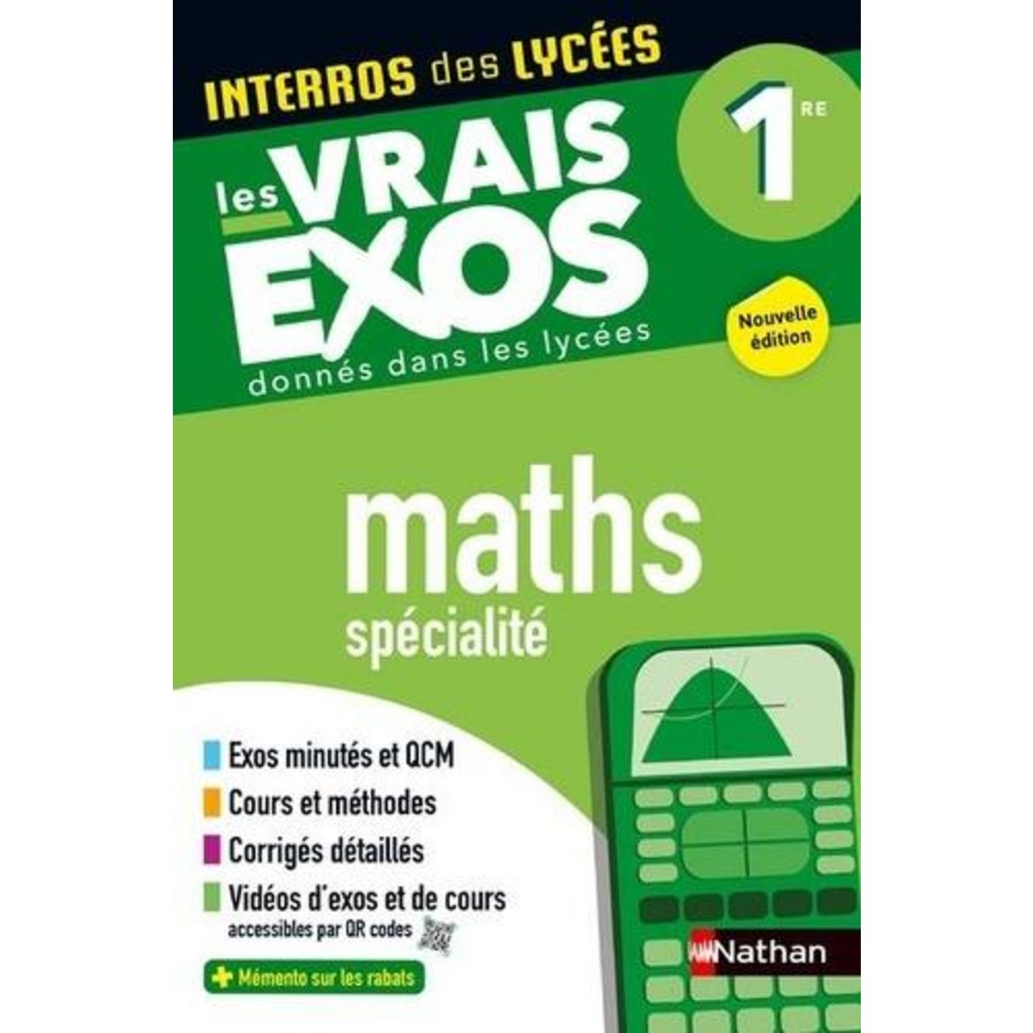 Interros des Lycées , la collection pour s'entraîner intensivement en Maths 1re ! Conforme à la réforme du Lycée Les vrais exos donnés dans les lycées - Des centaines d'exercices recueillis dans les lycées de France. - Des énoncés variés , de difficulté progressive, réellement posés par des professeurs dans les altes. - Tous les corrigés détaillés . Pour un entraînement efficace en maths - Des rappels de cours synthétiques. - Des QCM de vérification des connaissances. - Un minutage pour chaque exercice. - Des conseils méthodologiques. Des vidéos et des compléments numériques - Dans les vidéos , les auteurs vous expliquent le cours et vous aident à résoudre les exos . - Des liens vers des sites Internet et ressources numériques très utiles. - Une utilisation très simple grâce à l'application Nathan Live !