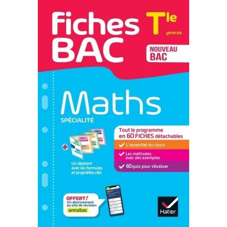 Des fiches de révision conformes au nouveau programme de Maths Tle générale : un outil 100 % efficace pour réussir l'épreuve de spécialité au bac. L'essentiel du programme de Maths Tle en fiches détachables Sur chaque thème du programme : - les points clés du cours - les méthodes à connaître, pour maîtriser les questions types - des quiz pour s'évaluer, avec les corrigés au verso INCLUS : dans un dépliant détachable De grandes cartes mentales pour mieux mémoriser OFFERT : un abonnement au site de révision annabac Pour accéder à des ressources complémentaires en Maths et dans d'autres matières : fiches, vidéos, quiz et sujets d'annales corrigés