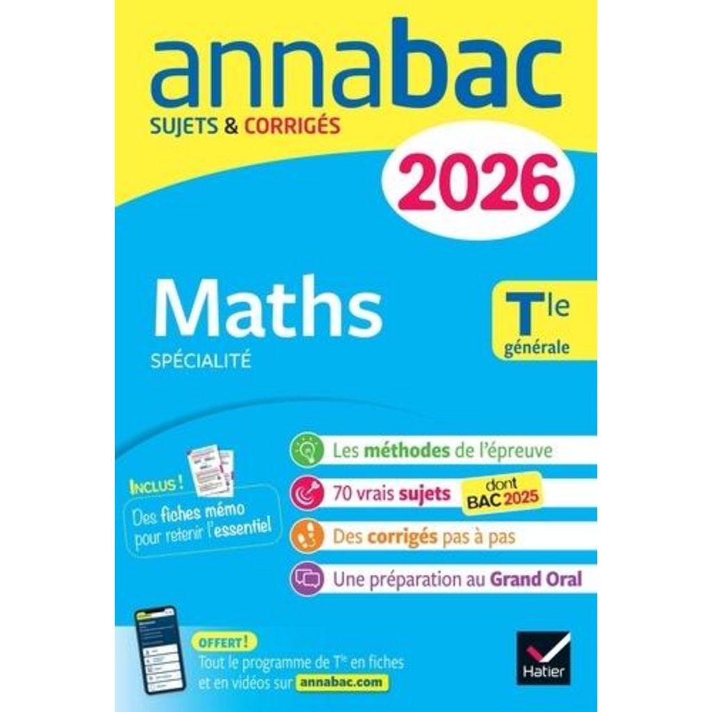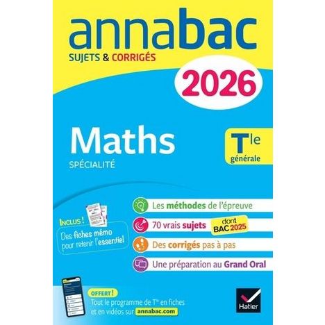 Pour réussir l'épreuve de Maths du bac 2026 ! - des sujets corrigés - des conseils de méthode - des fiches mémo couvrant tout le programme - un accompagnement efficace vers le Grand Oral - des vidéos Le succès assuré en 4 étapes ! 1. Comprendre l'épreuve, s'approprier les méthodes Des conseils de méthode et des sujets traités pas à pas pour comprendre comment analyser un énoncé d'exercice de bac et comment traiter les questions. 2. S'entraîner sur chaque notion du programme Des fiches mémo pour réviser l'essentiel et 60 sujets guidés, qui couvrent l'ensemble du programme de spécialité en Maths. 3. Préparer l'écrit dans la dernière ligne droite L'épreuve écrite approche : c'est le moment de réviser à l'aide des vidéos et des sujets complets de la session 2025, pour se mettre dans les conditions de l'examen. 4. Réussir le Grand Oral Des fiches de méthodes et des simulations d'oral sur des questions issues du programme de Maths. En plus, avec l'achat de l'ouvrage, un abonnement gratuit au site de révision http : //www. annabac. com (Lien -> http : //www. annabac. com/) : fiches et vidéos de cours, quiz, sujets corrigés...