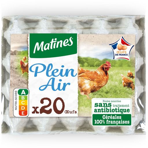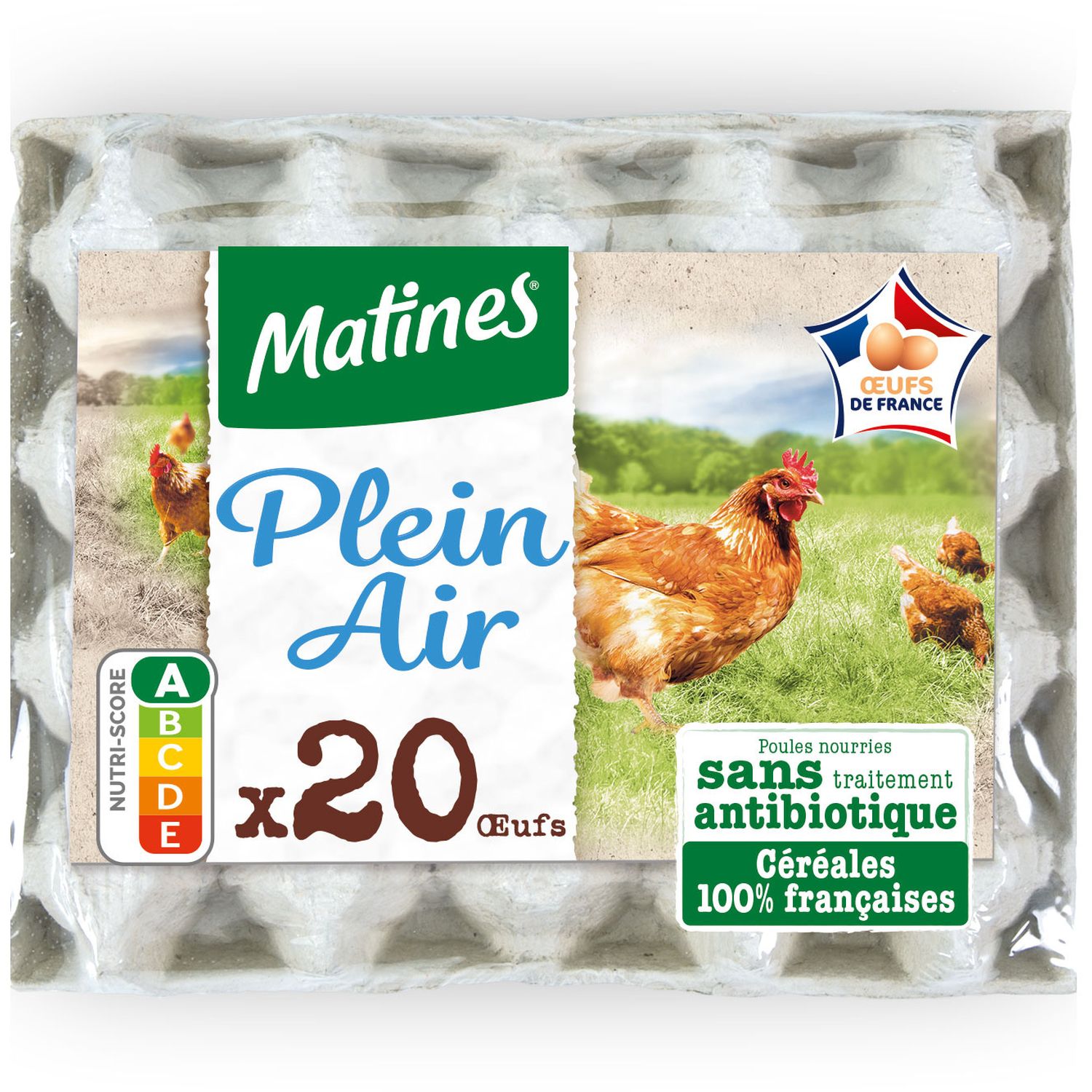 20 œufs de catégorie A de poules élevées en plein air Ramassés à la fraîcheur du matin Des bonnes pratiques d’élevage contrôlées par un organisme indépendant Prairie de 4m² minimum par poule Poules circulant librement sur la prairie dans la journée