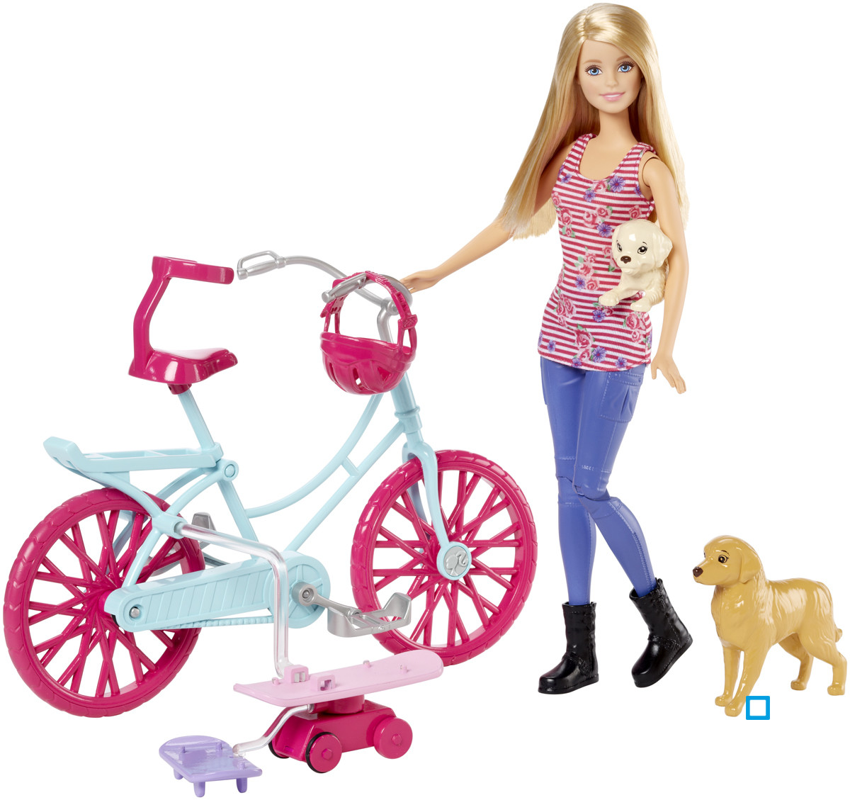 - Pousse le vélo de Barbie et observe les chiens qui tournent autour de la poupée!