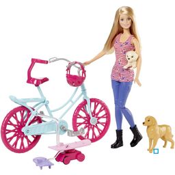 Emmène Barbie partout avec son vélo et ses deux chiens. Ils sont accrochés au vélo et font des tours à côté du vélo pendant que Barbie pédale.