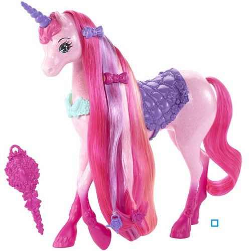 Très belle licorne Barbie au rose tendre et à la si longue crinière, qu’elle en frôle le sol ! De nombreux accessoires sont fournis permettant de réaliser de magnifiques coiffures a votre licorne notamment des tresses magiques.