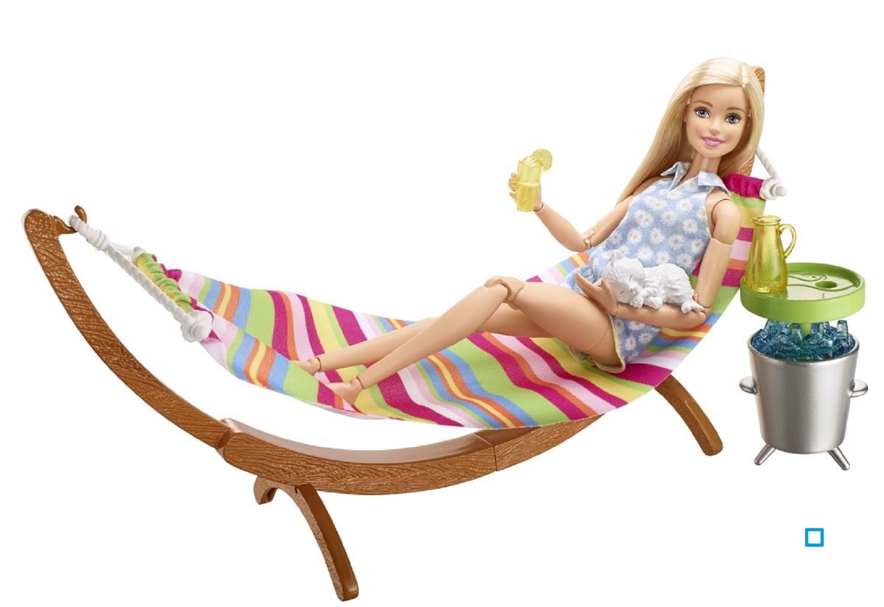 Grâce aux coffrets mobiliers, ta Barbie pourra s'adonner aux activités de plein air. Il existe 3 coffrets, en modèles aléatoires : l'un permettra à ta Barbie, lors des beaux jours, de se reposer tranquillement dans son hamac en compagnie de son petit chat. Elle pourra prendre une boisson rafraîchissante. L'un, des autres coffrets, comprend le nécessaire permettant à Barbie d'aller à la plage : sa serviette de plage, une chaise, un parasol et une glacière. Enfin, dans le dernier coffret, on retrouve un barbecue avec les différents aliments, une spatule, un gant, les pinces pour les grillades. Barbie sera toujours accompagnée de son petit chien.