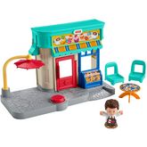 Bienvenue dans la boulangerie Little People ! Appuie sur le bouton pour ouvrir et refermer la porte de la boulangerie. Remets en place le parasol en le faisant pivoter, puis fais-le tourner encore et encore !