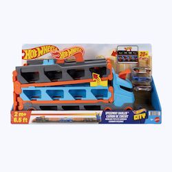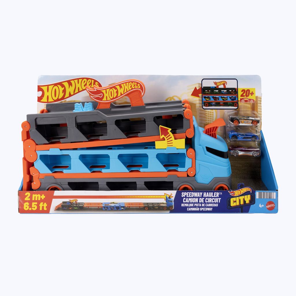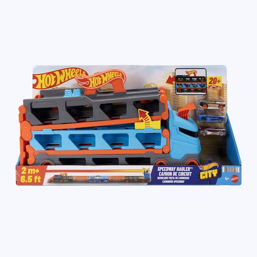 [Cet avis a été recueilli en réponse à une offre.] Mon fils de 5 ans raffole de ce camion transporteur de voitures qui se transforme en circuit afin de propulser les voitures . Il se déploie pour former une grande piste de course . Il dispose d'un bouton pressoir afin d'envoyer les voitures sur la piste , il y a 3 voitures incluses dans le pack . Il est compatible avec d'autres coffrets Hot Wheels que nous prendrons pour notre fils a Noël . Comme les coffrets de voitures car le transporteur peut en contenir 20 . Mon fils joue beaucoup avec son grand frère de 9 ans , ce camion transporteur amusera donc les enfants de tous âges .