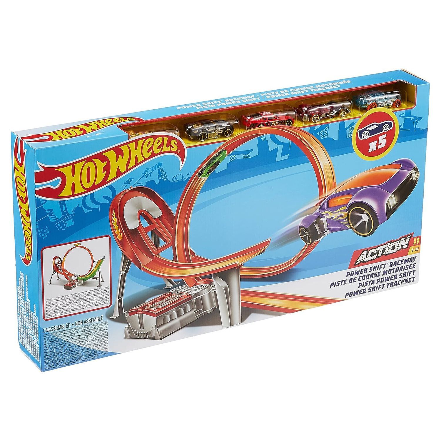 ette piste est le summum de l'action extrême sur une pente difficile à battre, et vous serez déstabilisé ! Les enfants pourront monter, descendre et parcourir la piste avec le lanceur motorisé à travers une boucle difficile et découvrir tout le plaisir et les sensations fortes des cascades spectaculaires que seuls Hot Wheels peuvent offrir. Vous pouvez également jouer avec plusieurs véhicules sur la piste en même temps et profiter de courses épiques Hot Wheels. Un booster motorisé est inclus pour activer les cascades et les scènes d'accident ainsi qu'un véhicule Hot Wheels.