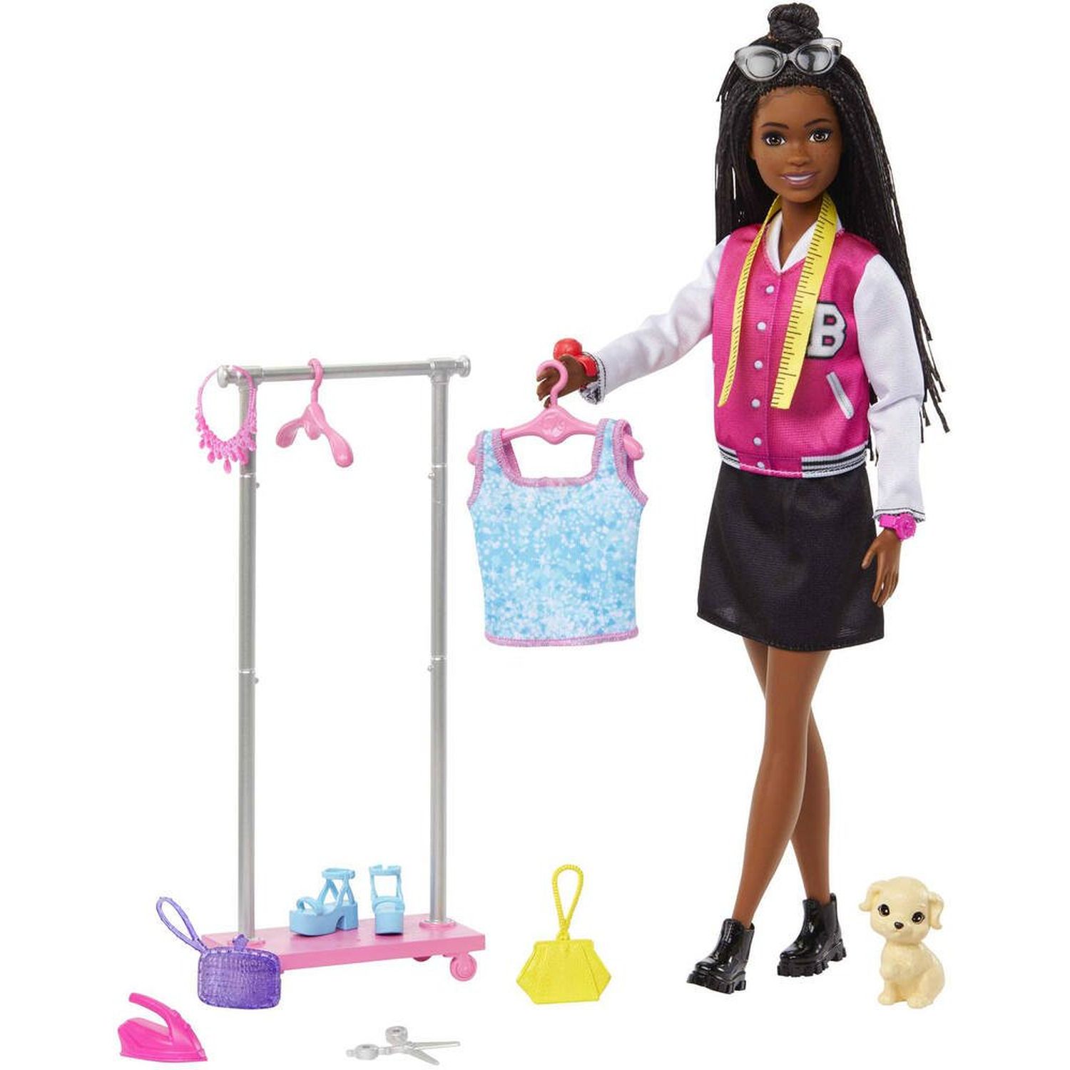 Les poupées Barbie Styliste pour la télévision permettent aux enfants de s'imaginer dans les coulisses d'une émission de télévision ! Inspiré de la série YouTube « Barbie & Barbie On Set », ce coffret Barbie porte sur le thème du dressing et de la création de costumes, et inclut une poupée Barbie Brooklyn, un chiot, un portant à vêtements et plus de 10 accessoires supplémentaires pour stimuler l'imagination. Les stylistes en herbe peuvent s'imaginer habiller les stars de l'émission avec la poupée Barbie Brooklyn ! La poupée ne tient pas debout toute seule. Les couleurs et les décorations peuvent varier.