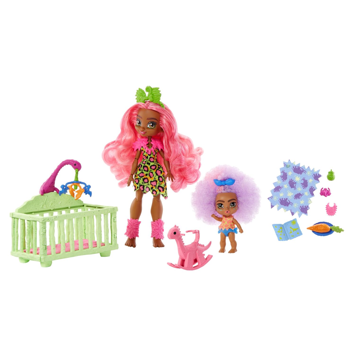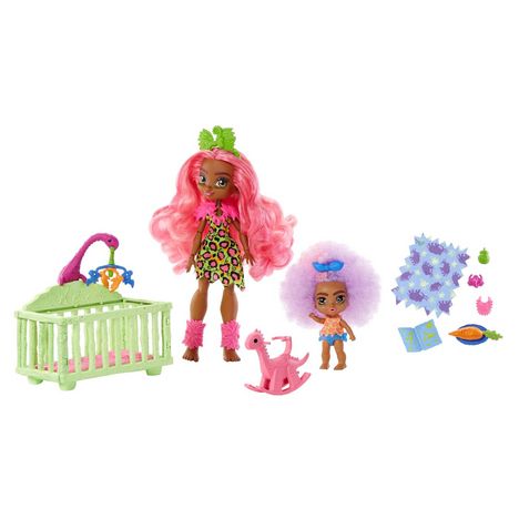 Découvrez Cave Club, des poupées de la Préhistoire à la personnalité décoiffante et très en avance sur leur temps ! Ce coffret Cave Club Babysitting comprend la poupée Fernessa et le Bébé des Cavernes Furrah. ?Fixez Furrah sur le dinosaure à bascule et poussez-la pour qu’elle se balance ! ?Le berceau est équipé d’un mobile de dinosaures qui tourne vraiment : activez-le manuellement pour que Furrah fasse de beaux rêves ! ?Une couverture et une tétine, un encas, un biberon, un livre et un bavoir permettront aux enfants d’imaginer tous les moments de la journée.