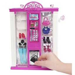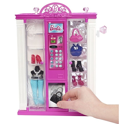 Voici le distributeur Mode Barbie, indispensable à toute Fashionista qui se respecte. Couleur fuchsia grand, astucieux et spacieux, il dispose de treize tablettes laquées noires pour disposer les accessoires modes de Barbie et ses copines (Sacs à main, collier, paire de chaussures).