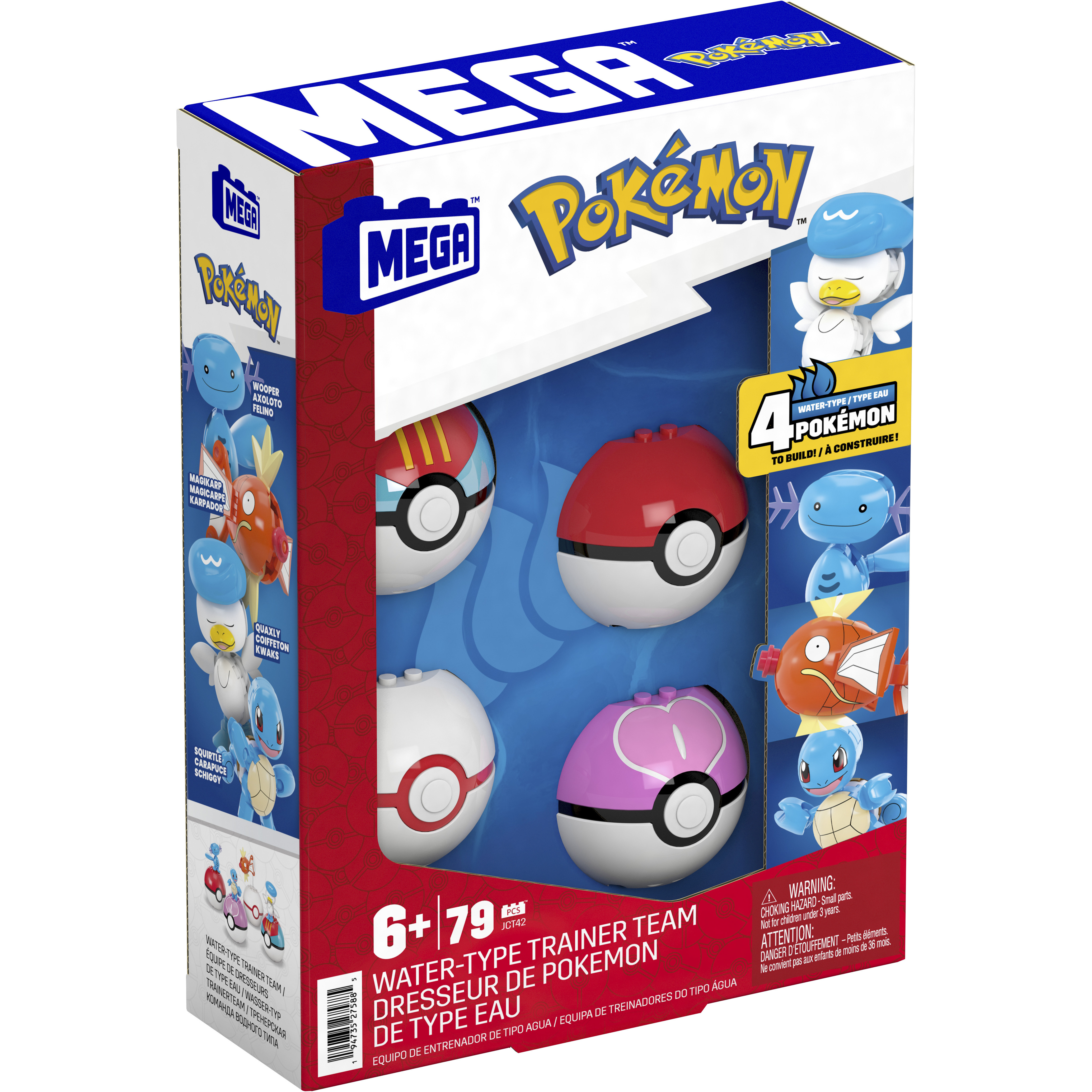 Pack de quatre Pokéballs, chacune contenant un Pokémon de type eau articulé à construire.