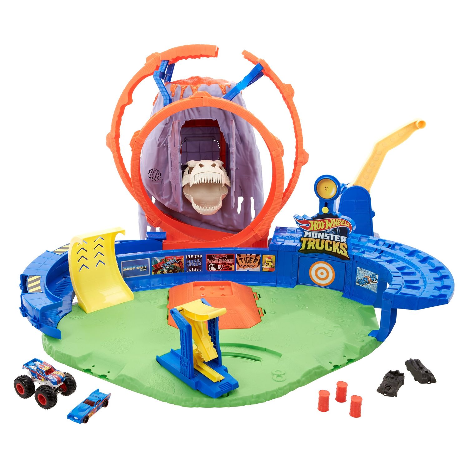 -Le coffret Hot Wheels Monster Trucks Le Volcan du T-Rex est une arène qui comprend 1 grand volcan, 1 ennemi T-Rex, 2 loopings, des lanceurs et plusieurs zones de crashs, de collisions, de cascades et de saltos.