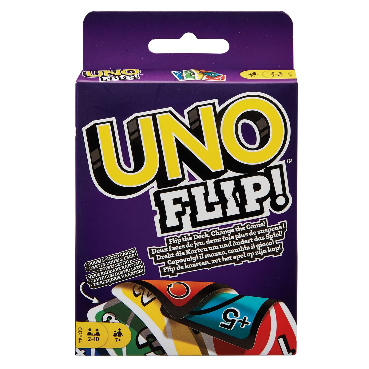 UNO aux cartes réversibles. Pose la carte ""Flip"" et tous les joueurs jouent avec le verso des cartes.