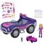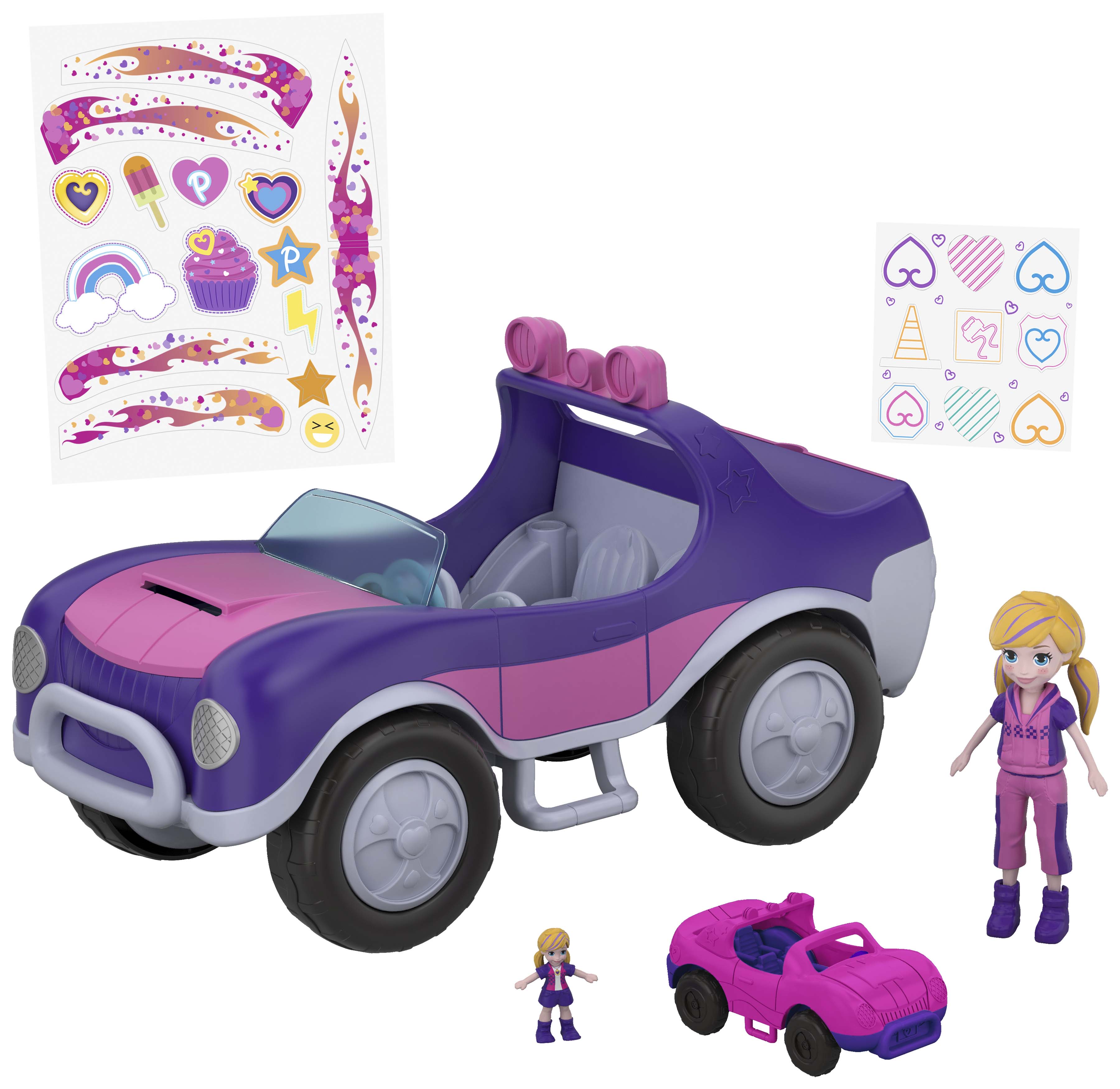 Polly Pocket la petite poupée est heureuse de vous présenter son super-sporty s.u.v. qui cache de nombreuses surprises ! Découvrez à l'intérieur de la voiture rose et violette une station de lavage qui se trouve dans le coffre ainsi que des autocollants amovibles en vinyle !