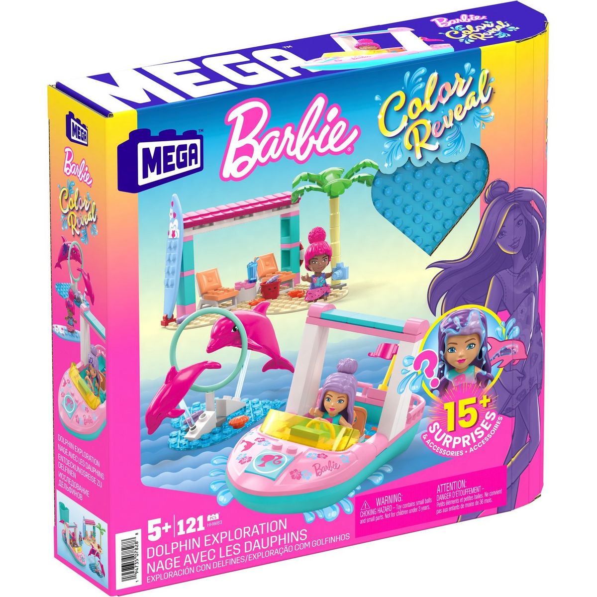Découvrez le jeu de construction Barbie Color Reveal Swim avec les Dauphins, un produit multicolore comprenant 121 pièces pour construire une cabane de plage et un bateau d'observation des dauphins. Ce jeu interactif inclut deux mini-poupées Barbie Color Reveal qui changent de couleur lorsqu'elles s