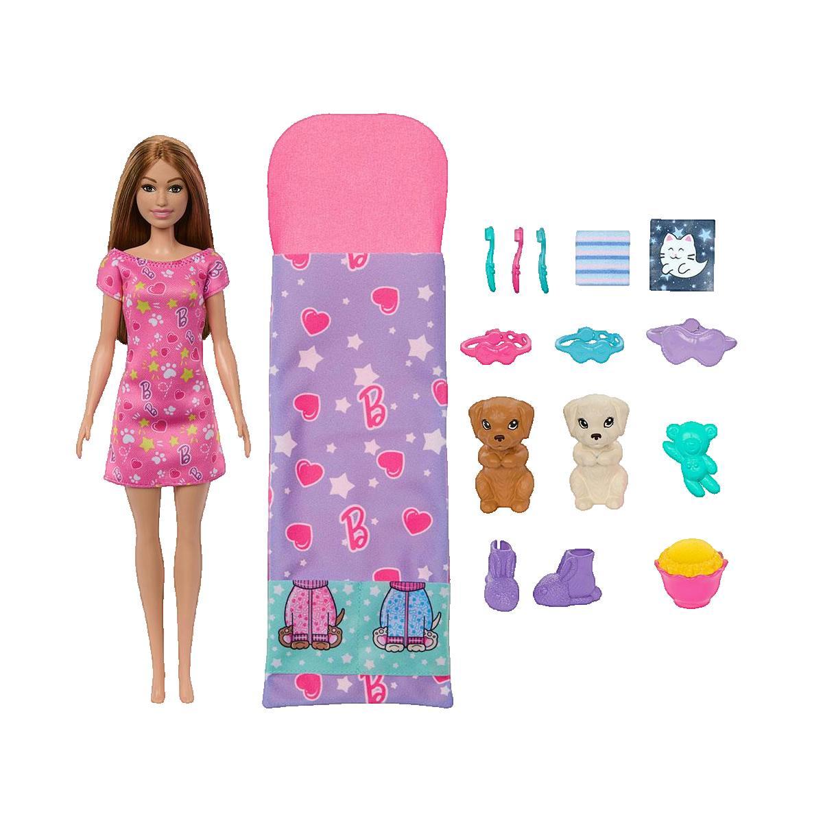 Barbie Soirée Pyjama est un coffret de jeu complet comprenant une poupée Barbie, deux chiots avec effet de changement de couleur, un sac de couchage, un masque pour les yeux et plus de 10 accessoires. Ce jouet est idéal pour les enfants dès 3 ans qui aiment les poupées et les animaux. La poupée port