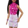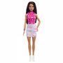 Chaque poupée Barbie Fashionistas possede son propre style et un look unique: décontractées ou bohemes, toutes les tenues s'inspirent des dernieres tendances! Cette poupée Barbie Fashionistas est inspirée par son look rock de 1986, avec un haut rose a imprimé étoiles et une jupe irisée a volants. Se
