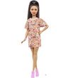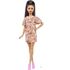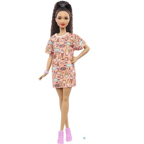 Barbie Fashionistas porte une robe tee-shirt originale avec un imprimé à base de cornets de glace. Son bracelet violet et ses baskets roses compensées rajoutent des notes de couleur tendance.