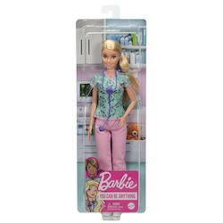 Explorez le monde des soins avec la poupée Barbie infirmière ! Avec Barbie, les enfants peuvent être tout ce qu’ils veulent, alors pourquoi ne pas devenir infirmière quand on aime aider et prendre soin des autres ? Cette poupée Barbie infirmière (30,4 cm) porte une adorable blouse d’infirmière à motifs d’instruments médicaux, un pantalon rose et des chaussures blanches, ainsi qu’une queue de cheval soignée. Elle est aussi fournie avec un stéthoscope autour du cou. Les enfants vont adorer les possibilités infinies de création et d’expression qu’offre ce coffret. La poupée ne tient pas debout toute seule. Les couleurs et les décorations peuvent varier. Excellente idée cadeau pour les enfants à partir de 3 ans.