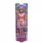 Barbie joue les licornes avec son diadème et une queue de cheval autour de sa taille cintrée. Une jupette et de longues bottes rose complètent sa tenue.