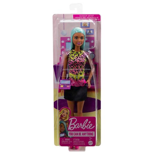 La poupée Barbie® Maquilleuse est prête à sublimer sa clientèle avec son tablier de maquilleuse imprimé et les accessoires de maquillage inclus. Affichant elle-même un look fabuleux avec ses magnifiques cheveux bleu clair, son haut à imprimé léopard et ses chaussures compensées roses, la poupée Barbie® Maquilleuse donnera envie aux enfants de 3 ans et plus d’aller au bout de leurs rêves. La poupée ne tient pas debout toute seule. Les couleurs et les décorations peuvent varier.