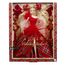 La poupée porte une robe bustier en satin rouge avec une jupe aux motifs à carreaux et ouverte sur ses jambes. Un large nœud over size orne son jupon.