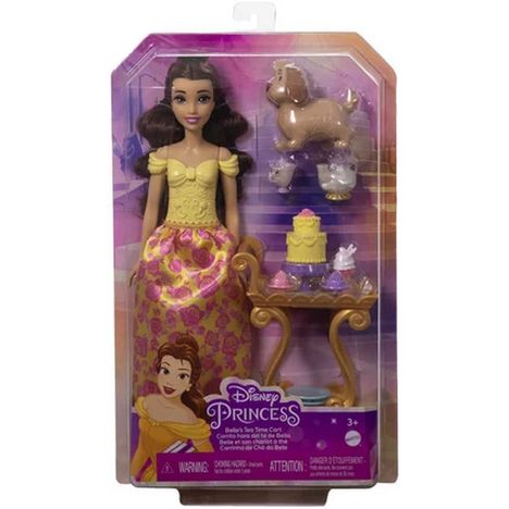 La Princesse Disney Belle et ses amis se préparer pour prendre le thé, munit de son chariot et d'accessoires. Belle est une poupée articulée, resplendissante dans sa couleur fétiche jaune.