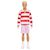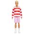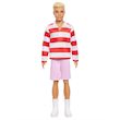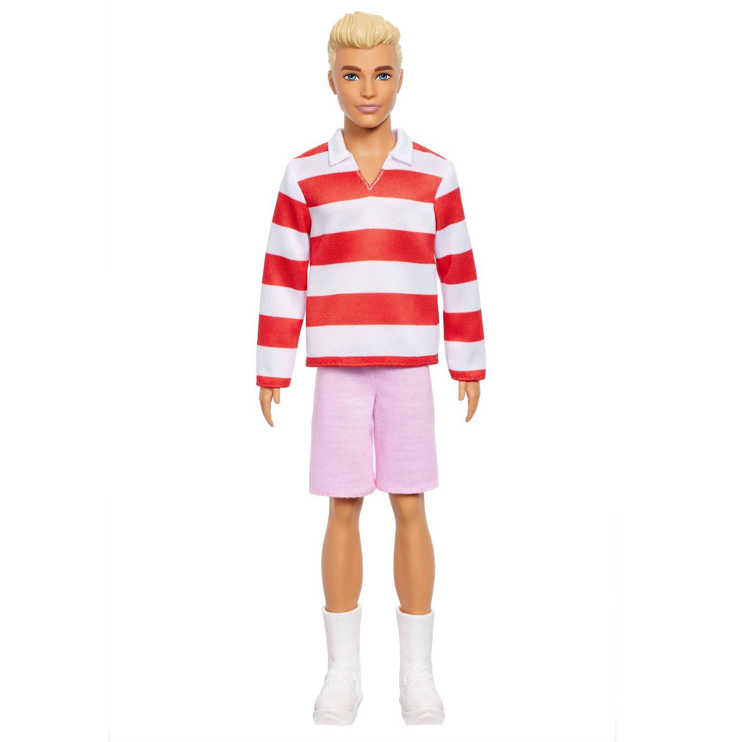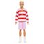 Ken porte un magnifique polo à manches longues avec des rayures rouges et blanches et un bermuda de couleur rose. Des boots blancs complètent sa tenue.