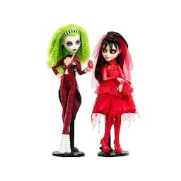 Découvrez la collection exclusive Beetlejuice de Mattel, comprenant des poupées articulées de Lydia Deetz et Beetlejuice inspirées du film Beetlejuice. Lydia mesure environ 26,6 cm, vêtue d'une robe en tulle rouge, et Beetlejuice mesure environ 28,5 cm, vêtu d'un costume rayé rouge. Fabriquées en ti