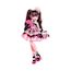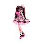 Découvrez la poupée Draculaura de la collection Monster High de Mattel. Cette poupée, célébrant son 1600e anniversaire, présente un look unique avec une robe satinée rose, une jupe en toile d'araignée, des gants noirs, un collier de perles et des chaussures à talons. Elle est accompagnée d'accessoir
