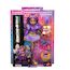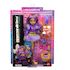 C’est la rentrée pour Clawdeen et son animal ! Jupe en acrylique sauvage et blouson, violets, chaussures et bijoux dorés. 7 accessoires sont inclus.