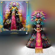 La poupée Monster High Skelita Calaveras de Mattel est une pièce de collection inspirée du Día de Muertos. Elle mesure 28 cm et présente une robe en satin noir ornée de motifs colorés traditionnels mexicains. La poupée est accompagnée d'une coiffe décorée de motifs Quetzalcóatl et d'un collier, refl