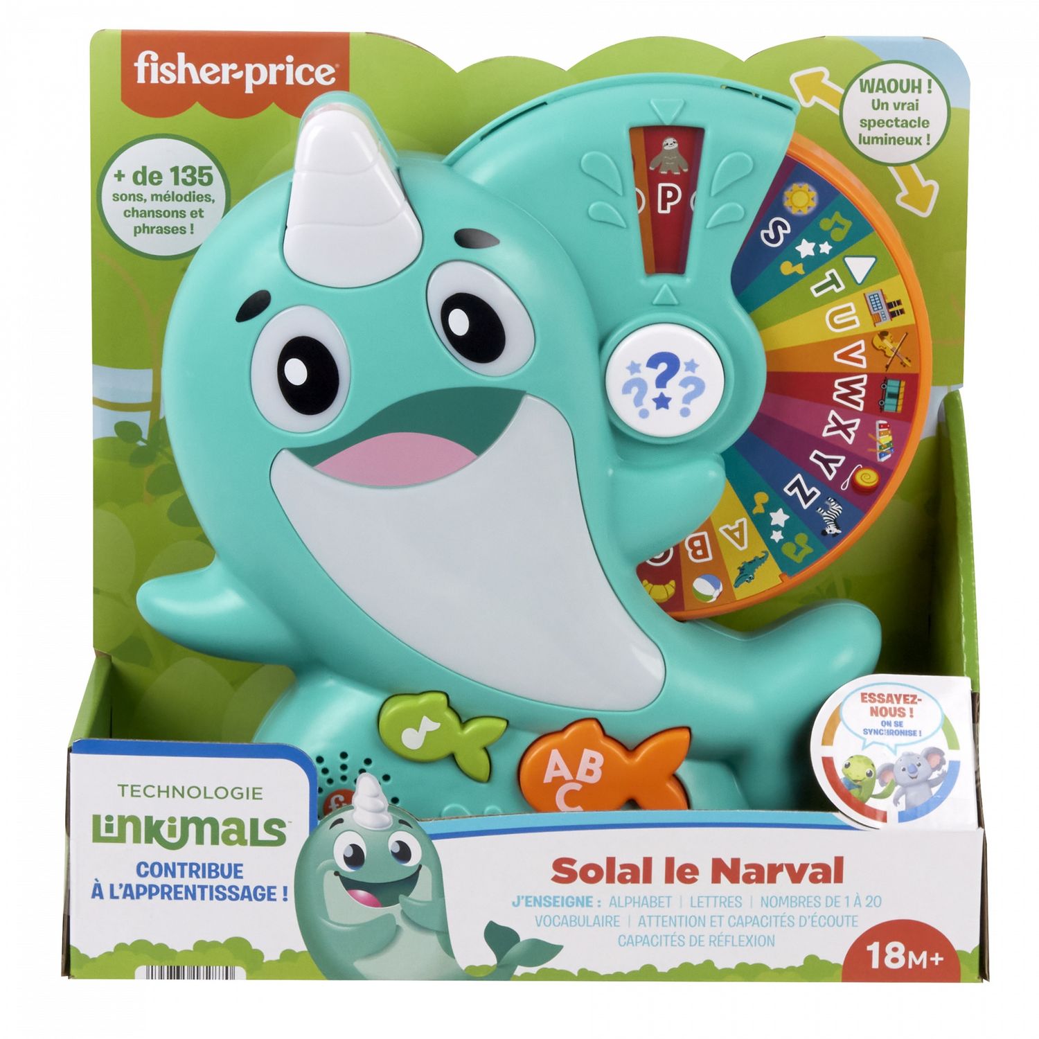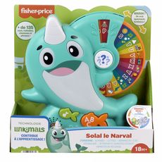 [Cet avis a été recueilli en réponse à une offre.] Fisher-Price-Linkimals-Solal le Narval-Jouet d’éveil musical, français. Très sympa, fait de la lumière, apprentissage de l'alphabet, des couleurs, des chiffres et des mots en chanson. Jeux : trouve les mots avec la recherche des lettres part système de roue. Mon fils adore.