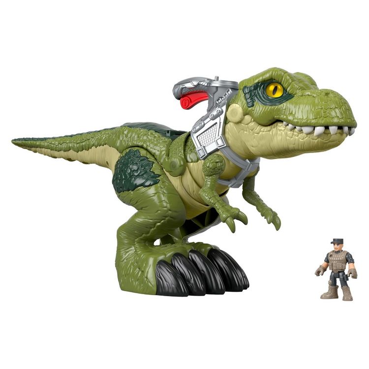 Imagine des aventures palpitantes grâce à ce T-Rex géant. Fais-le avancer et croquer la figurine humaine grâce à la gâchette qui fera claquer ses mâchoires. Récupère la figurine grâce à la trappe sur son dos et repars à l’attaque.