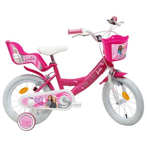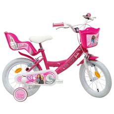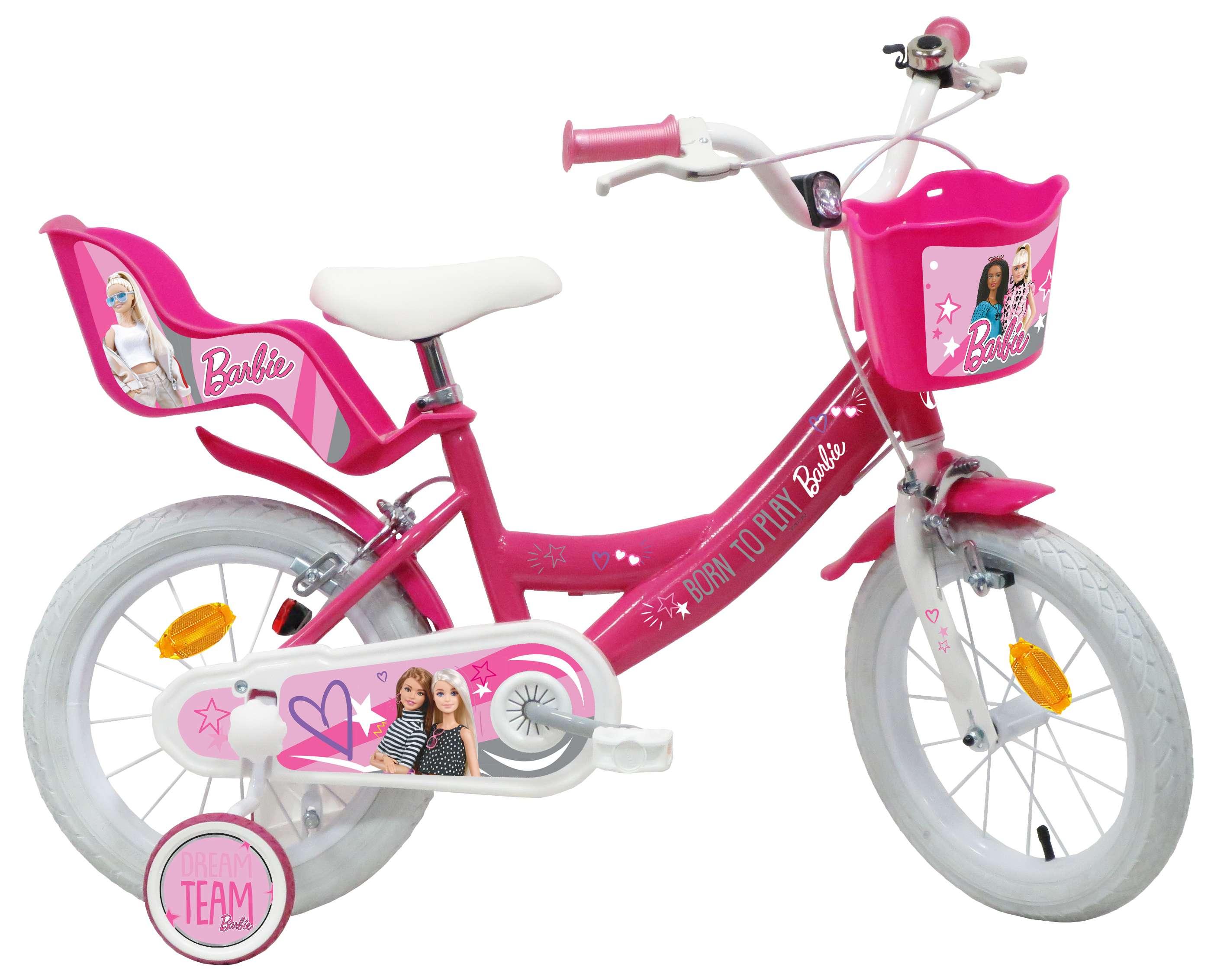 Vélo enfant - Modèle 14'' Barbie pour enfant de 95/110 cm avec stabilisateurs - 2 freins - Panier avant - Porte poupée arrière