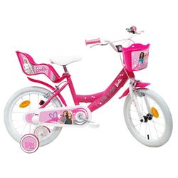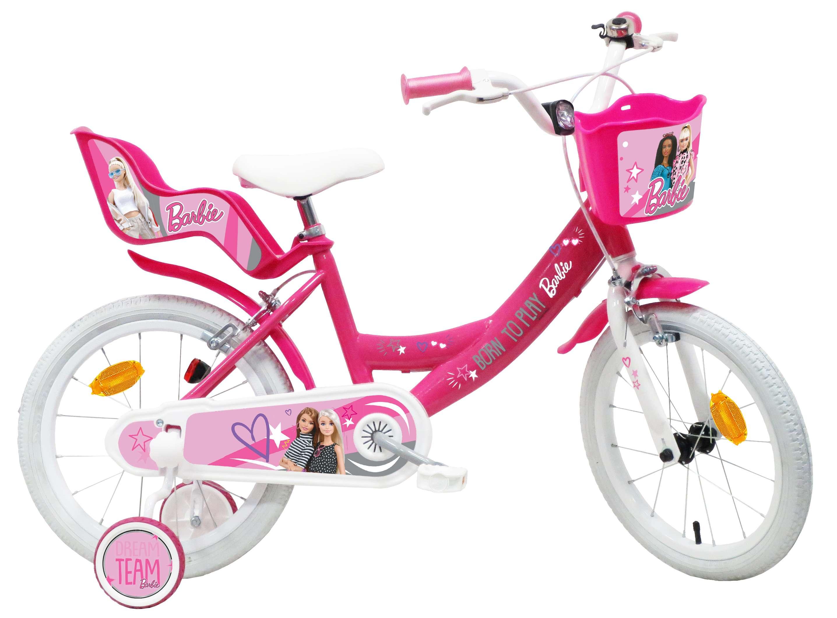 Vélo enfant - Modèle Barbie 16'' pour enfant de 105 à 120 cm avec stabilisateurs - Panier avant - Porte poupée arrière - 2 freins & Roues gonflables