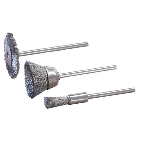3 brossettes acier : roue 20 mm, cuvette 13 mm, pinceau 4 mm.