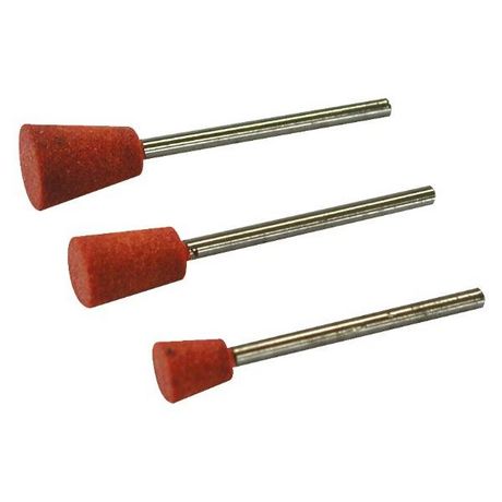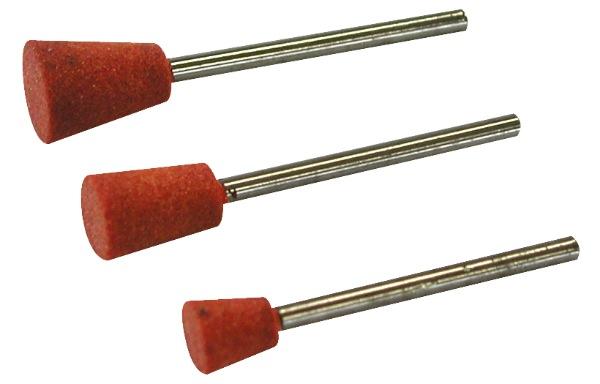 3 meules corindon, de forme conique. Diamètres : 6 / 8 / 10 mm.Pour aiguiser, ébarber, rectifier la plupart des métaux et la porcelaine. Tige Ø, 2,35 mm.