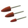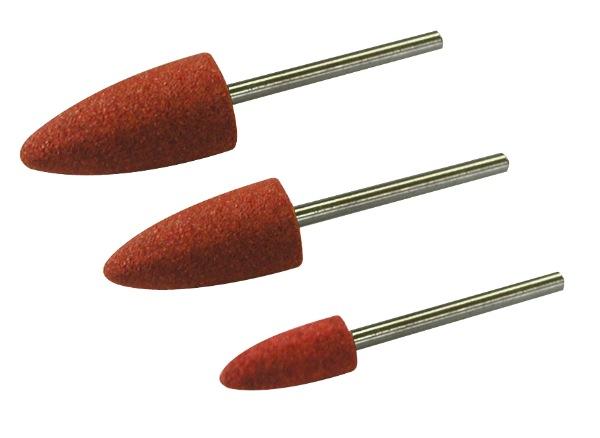 3 meules corindon, en forme d',ogives. Dimensions : 10 x 20 mm / 8 x 15 mm / 7 x 12 mm.Pour aiguiser, ébarber, rectifier la plupart des métaux et la porcelaine. Tige Ø, 2,35 mm.