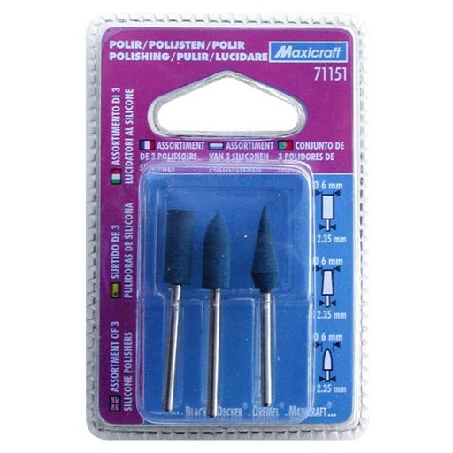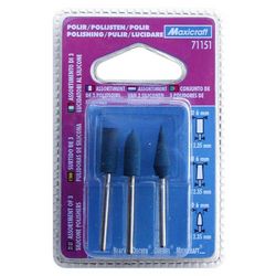 3 polissoirs silicone haute qualité : cylindrique, ogive et conique.Pour polissage et finition de tous les métaux ferreux.Eliminent les irrégularités et les rayures produites par l&rsquo,affûtage et le ponçage.Nettoient les rainures. S&rsquo,utilisent aussi sur les pierres précieuses et la céramique