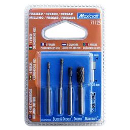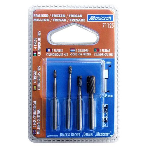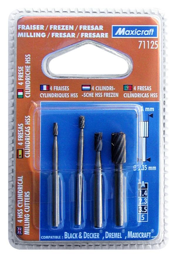 4 fraises HSS. Forme : cylindrique, diamètres : 1,4 / 2,3 / 3,5 / 5,0 mm.