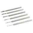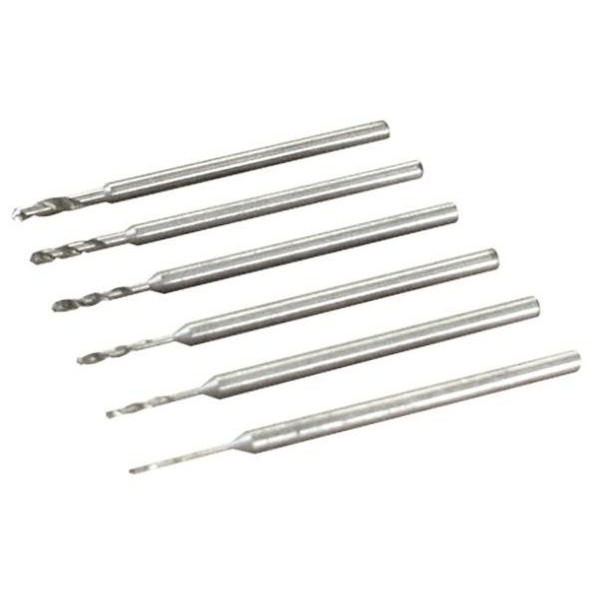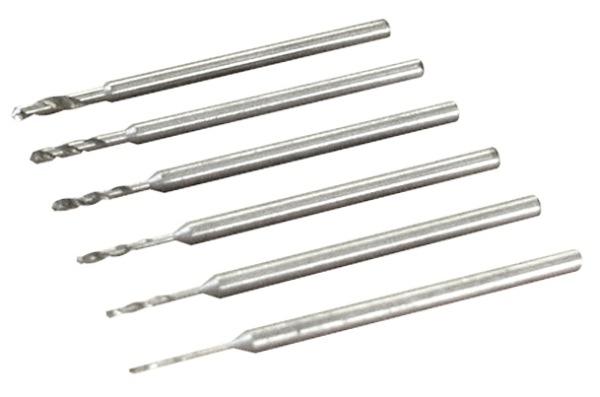 6 forêts HSS hélicoidaux. Diamètres : 0,6 / 0,8 / 1,0 / 1,2 / 1,5 / 1,8 mm.