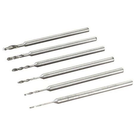 6 forêts HSS hélicoidaux. Diamètres : 0,6 / 0,8 / 1,0 / 1,2 / 1,5 / 1,8 mm.Pour le perçage des métaux, des pierres précieuses, des matières plastiques,du bois...Forets avec queue épaulée : le diamètre de la partie coupante est la dimension nominale et la partie pincée par le mandrin est plus importa